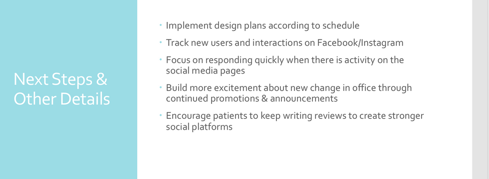 One of my clients is a family and cosmetic dental office located in Wolcott, CT. I have personally designed a website, that now allows patients to book appointments online, and modernized the practice with new and upgraded social media accounts. The original marketing plan is shown below from the start of this project, as well as links to the current website and social media pages,.